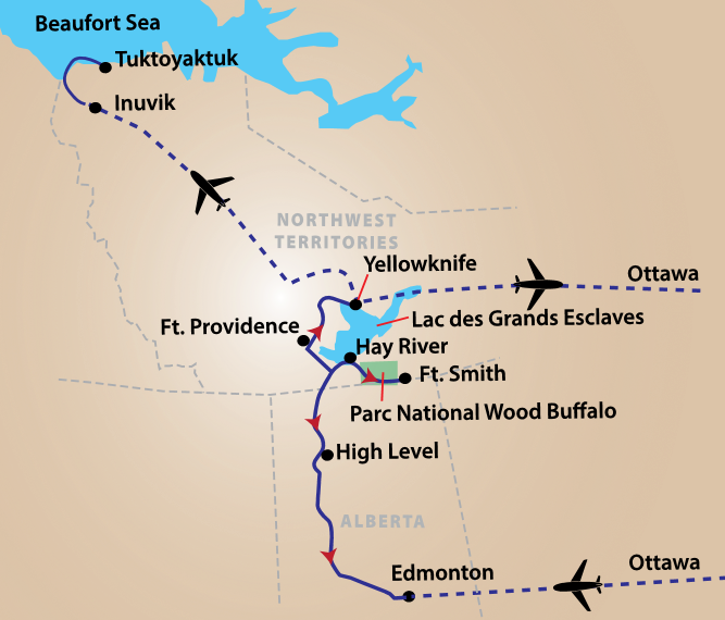 Les points saillants de ce voyage sont sans contredit la visite de la capitale Yellowknife et la découverte des municipalités d’Inuvik et de Tuktoyaktuk, sur les berges de la mer de Beaufort. Ce circuit nous permettra d’explorer plusieurs communautés importantes de ces grands territoires, notamment Fort Smith, Hay River, Fort Providence et Inuvik, ainsi que les nombreux sites naturels, d’une beauté absolue !
